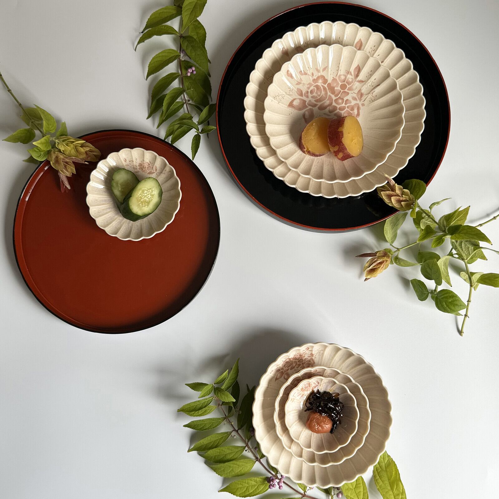 シックなステンシル調のローズを味わいのある和食器にデザインしました。卯の斑という透明の釉薬を使用しており、美しい模様が特徴の逸品。縁が少し上がっているので、汁気のあるおかずも受け止めてくれます。朝食にはもちろん、夕食にはお魚やしょうが焼きなどおかずをのせるのもおすすめ。